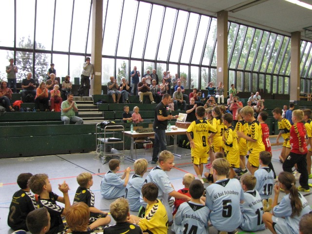 Spannendes Spiel gegen den NachbarnHeike Merk Am Sonntag 12.10. 2014 trafen die Mannschaften aus Bad Schönborn und Kronau in der Mehrzweckhalle in Kronau aufeinander. Das letzte Spiel der beiden Mannschaften beim Turnier in Bad Schönborn endete mit einem spannenden Penaltywerfen mit dem besseren Ende für Kronau. Man konnte also auch diesmal ein sehr spannendes Spiel erwarten. Die erste Halbzeit wechselten sich die zwei Mannschaften, wie erwartet, mit den Torwürfen ab. Zur Halbzeitpause stand es dann auch nur 9:8 für den HV. Auch im Laufe der zweiten Halbzeit konnte sich keine der beiden Mannschaften absetzen, was zum Schluß zu einem knappen Endergebnis von 13:12 für die Gastgeber aus Kronau führte. Nach Torschützen machte das jedoch eine Punkteergebnis von 96 - 65 zu Gunsten der Gästemannschaft aus Bad Schönborn. Es spielten: Leonard Zaum, Teresa Wibert, Annika Michel, Julius Cziborra, Julien Stark, Levin Singler, Luca Kramer, Marcel Weber, Frederik Heid, Finn Kleinlagel, Xander Joa |
